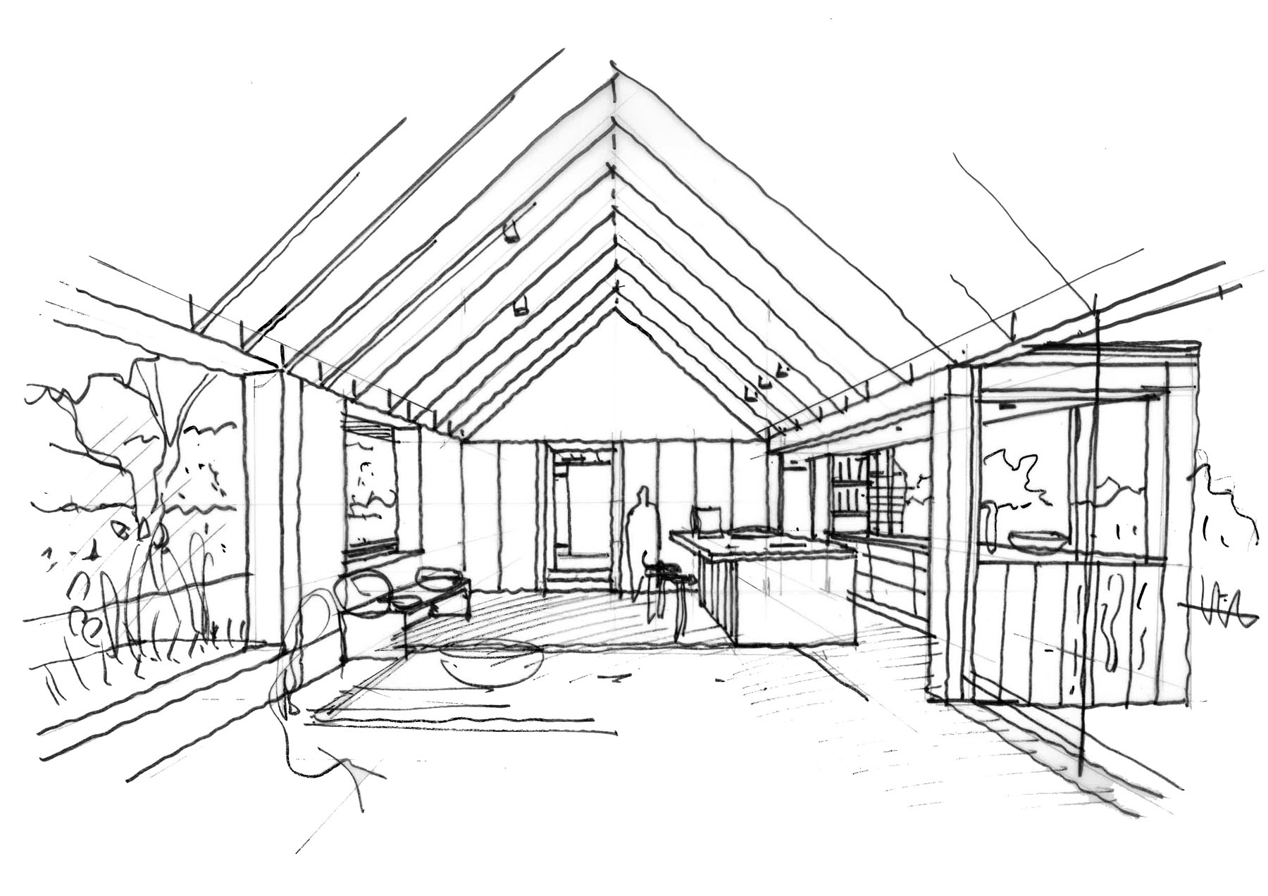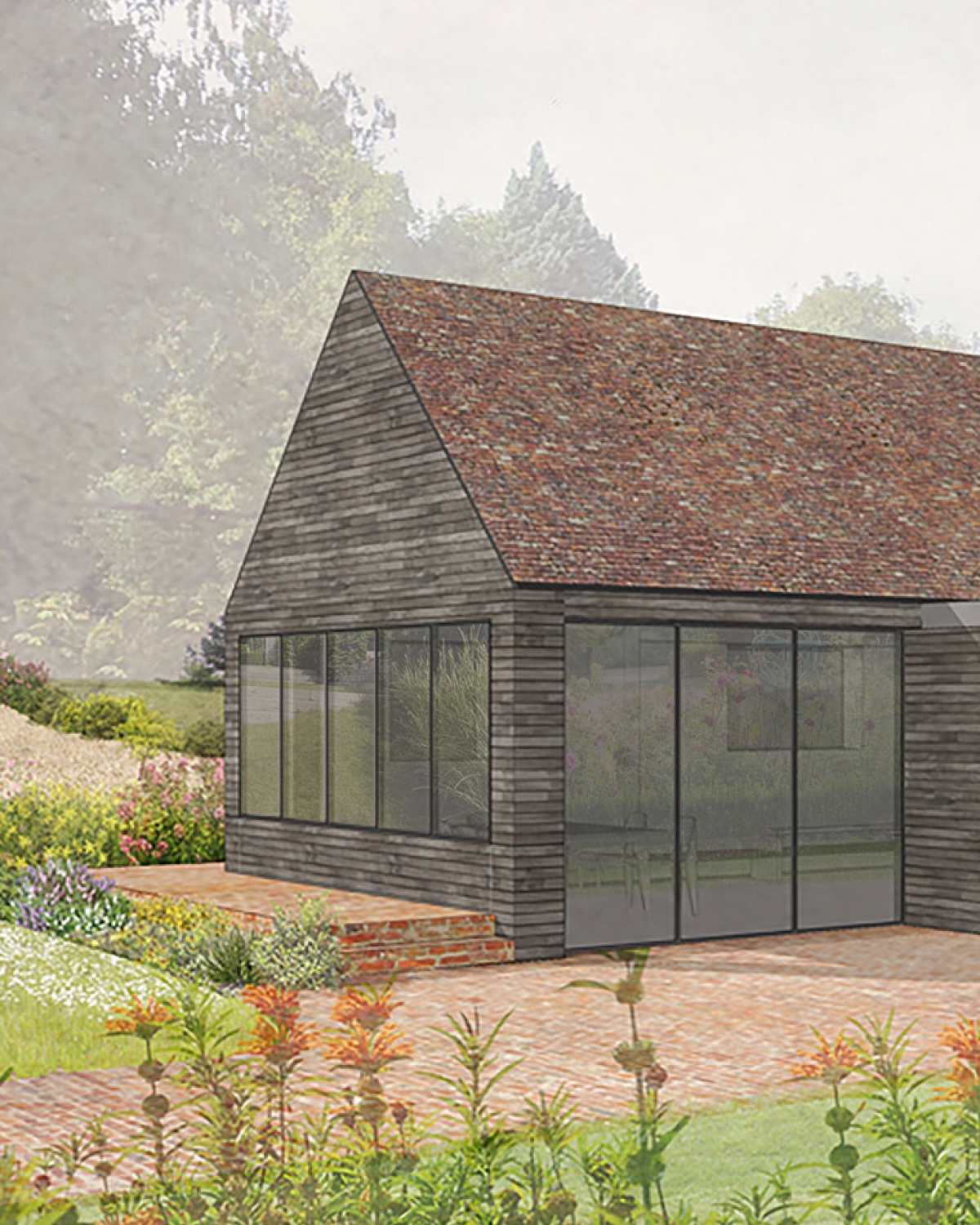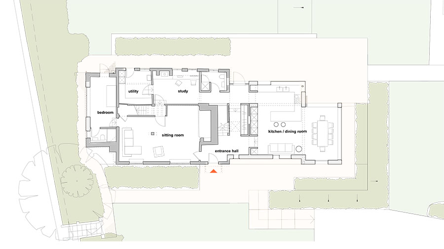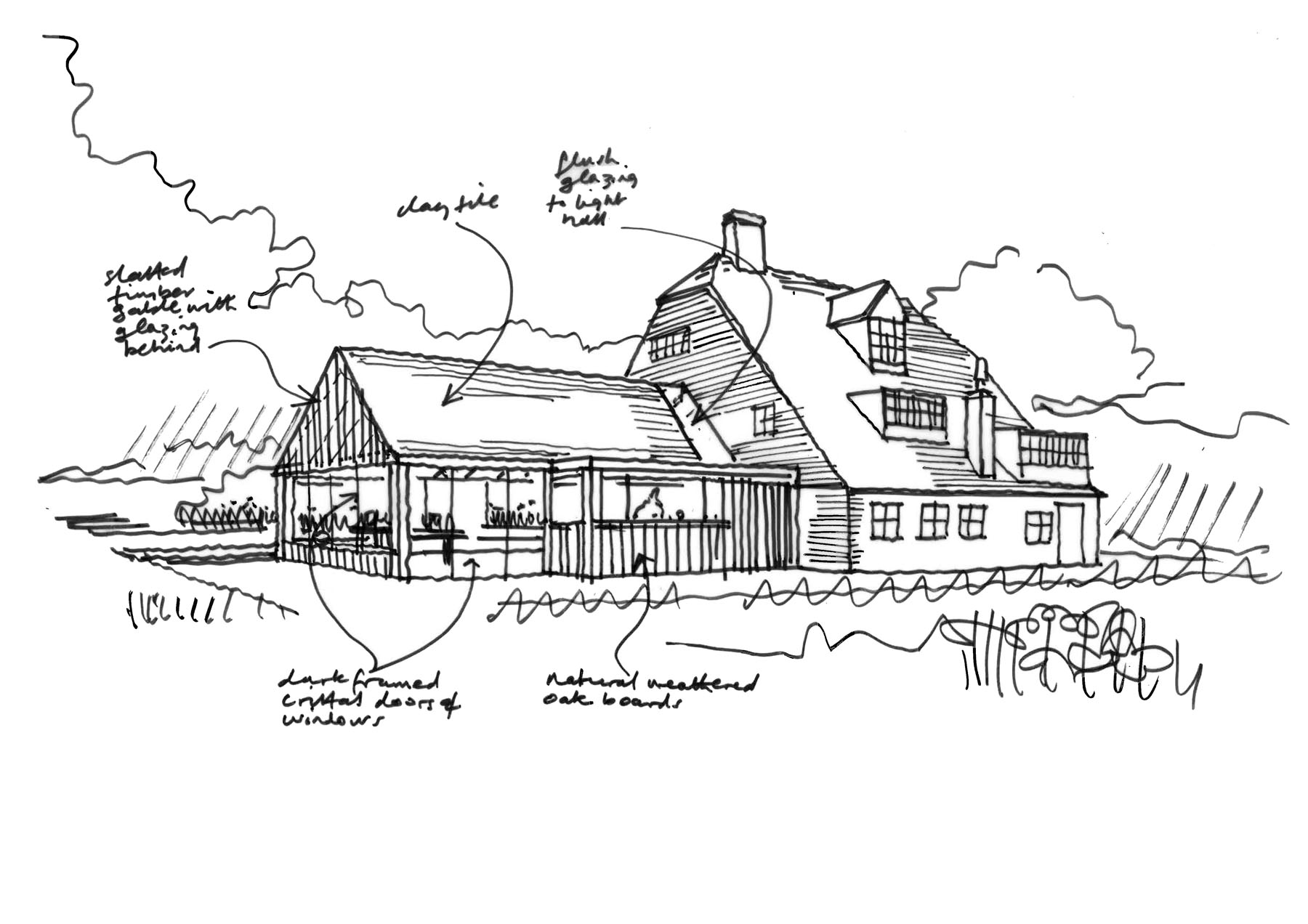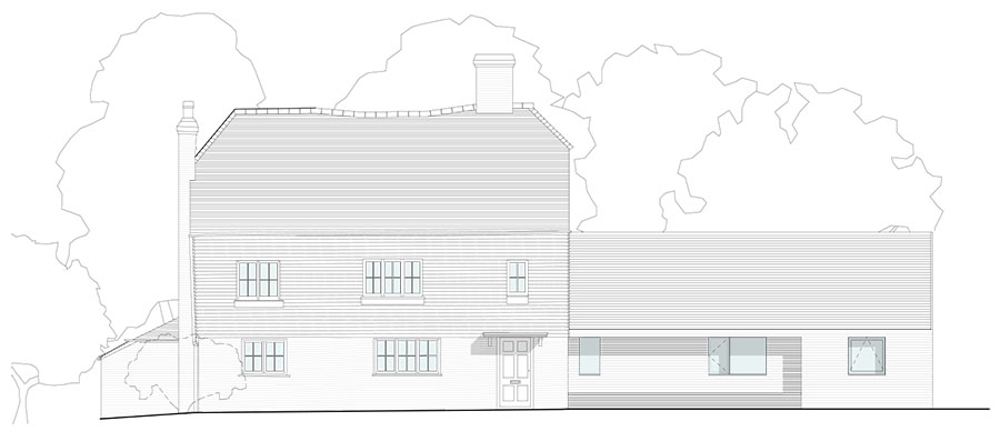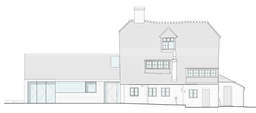 The proposed design removes these additions and creates a new single side extension in its place to house a single large kitchen and family room. The new extension will be contemporary in style contrast well with the existing traditional Sussex farmhouse rooms. Further replanning is taking place within the existing house where the kitchen has been relocated into the new extension.