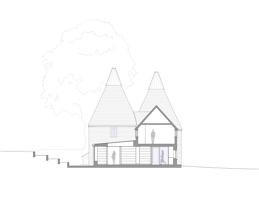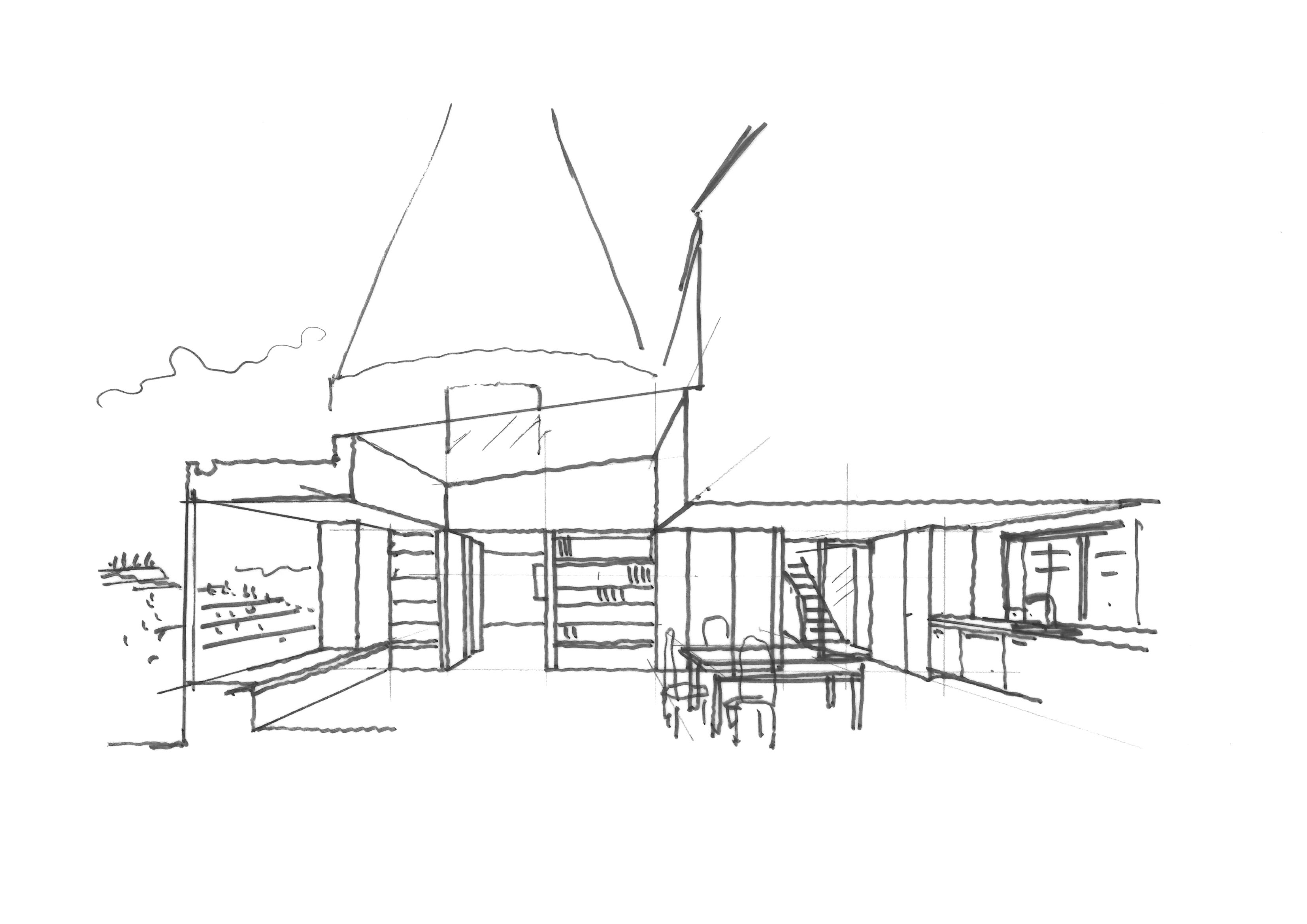 A shallow mono-pitched zinc clad roof slopes away from the former barn and a lower slender piece of flat roof forms the junction between the proposed zinc roof and the rebuilt roundel. The junction between both is further minimized by locally stepping back in plan, touching the roundel lightly. A large glazed roof light, flush with the sloping zinc roof maximises the light brought into the previously dark plan, from above as well as affording views to the tall oak trees in the garden. From a planning standpoint the extension was required to be set behind the house to maintain the existing long distance views.