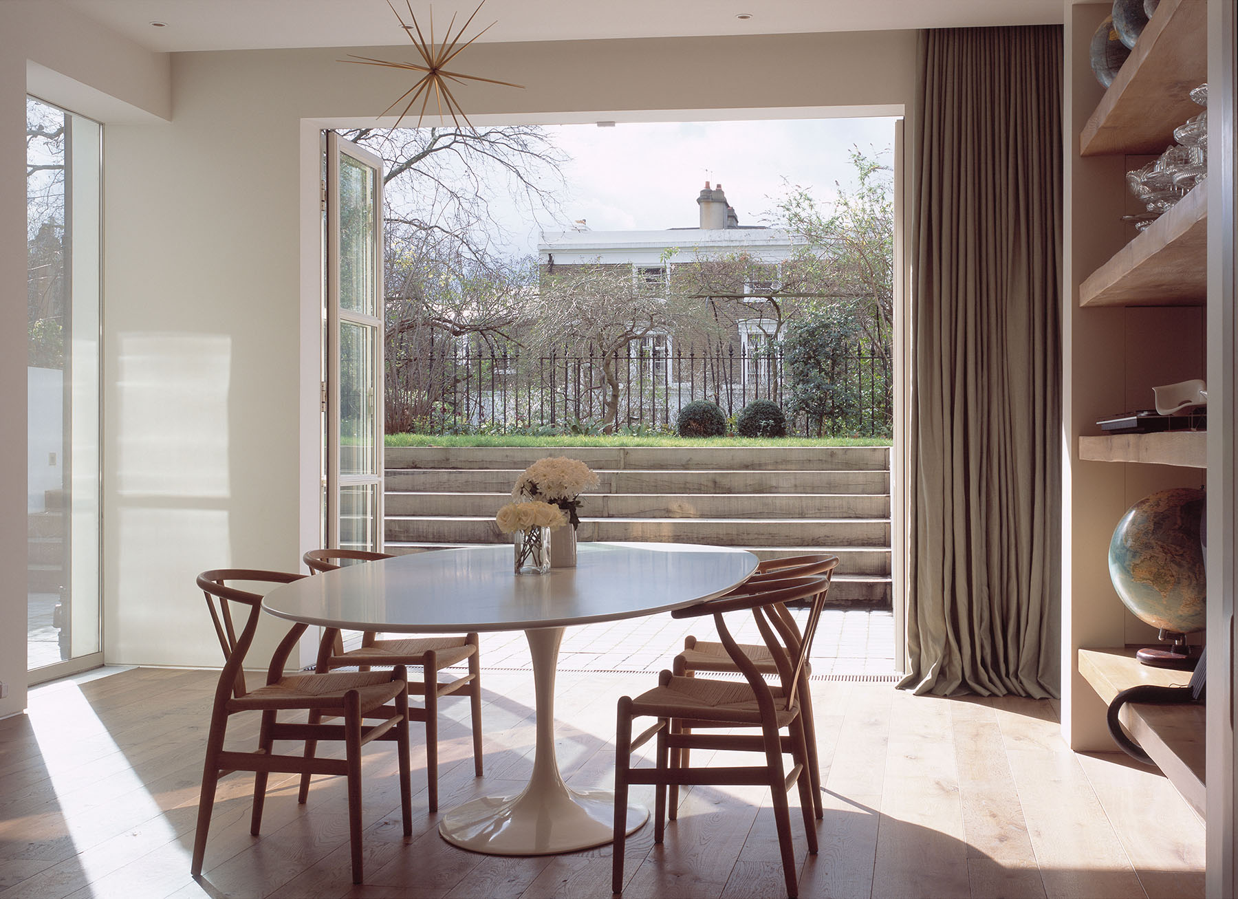 This family with three boys wished to create a stylish home that would work for them all as the children grew up. External space at the entrance and garden levels was maximised by excavating and building a new extension to the side of the main house over the garage. Generous ancillary spaces for the garage, laundry, wine storage, plant and house storage allowed the principal living areas to occupy prime spaces on lower ground and ground floors.