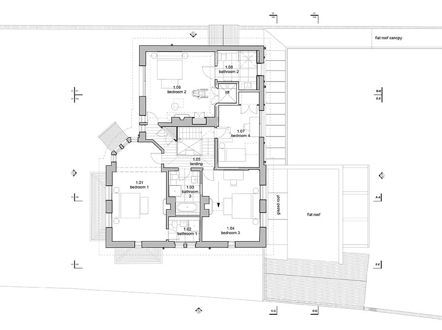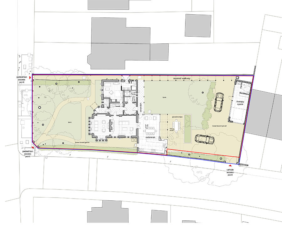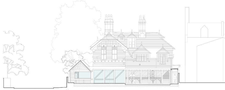 Our design concept is to create an extension that enhances the original house by retaining a significant portion of the original 1920s single storey pitched roof extension and verandah structures but introduces a contemporary link extension between them. The newly altered and refurbished structures, linked by a new single-storey contemporary kitchen and dining room extension, is set behind a new pergola structure that creates a continual visual rhythm of vertical posts around the house and garden. This gives the rear elevation and garden perimeter a coherent unity. The new extension will replace the existing conglomeration of structures added in an ad hoc way in the early 20th century. The flat roofs of the new extension and refurbished verandah will allow more of the original house rear elevation to be appreciated, currently obscured by low quality mono-pitch roofs. A new glazed roof to the verandah will allow more light into the rear rooms of the main house and the pergola in front of the new single storey extension will give some protection from direct sunlight in the summer.