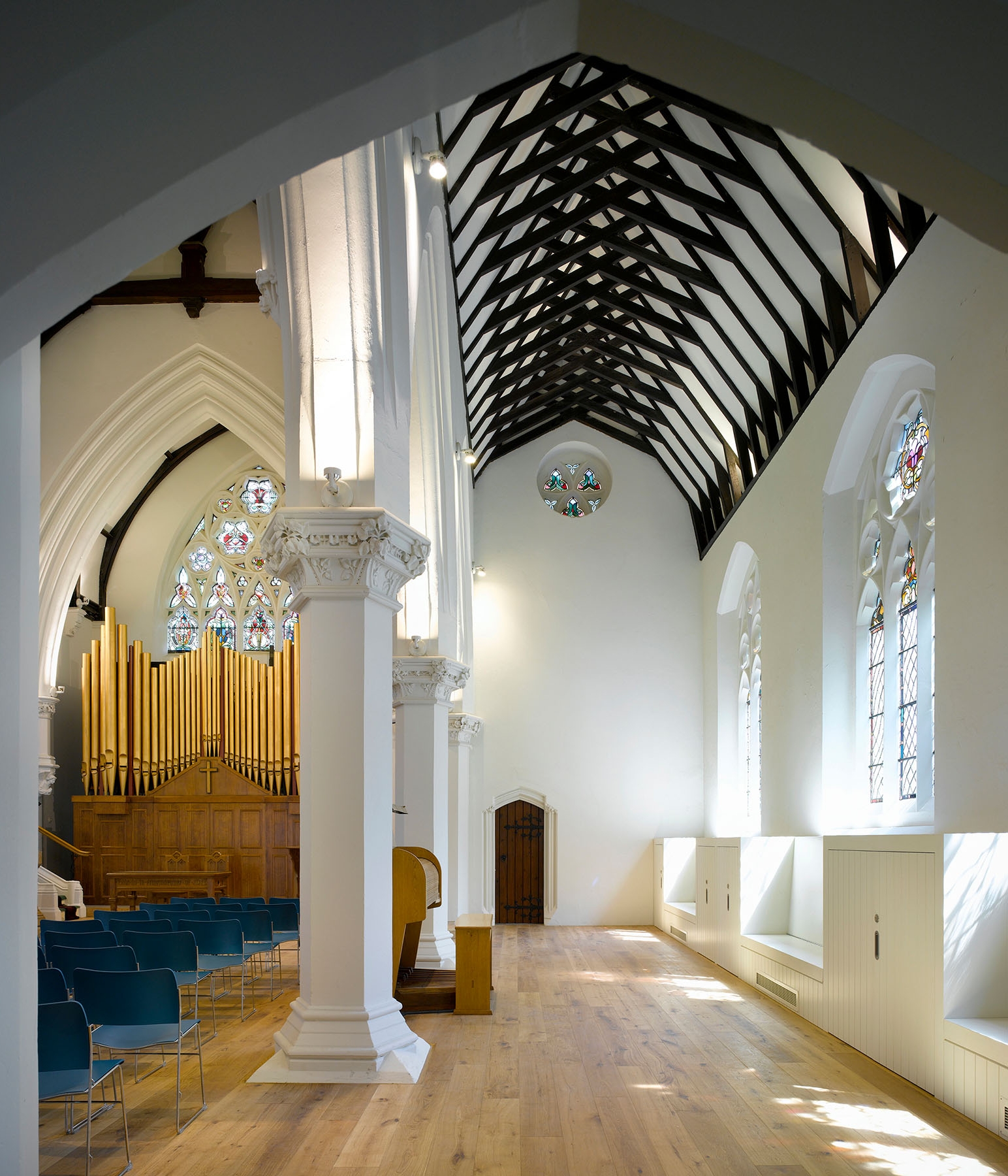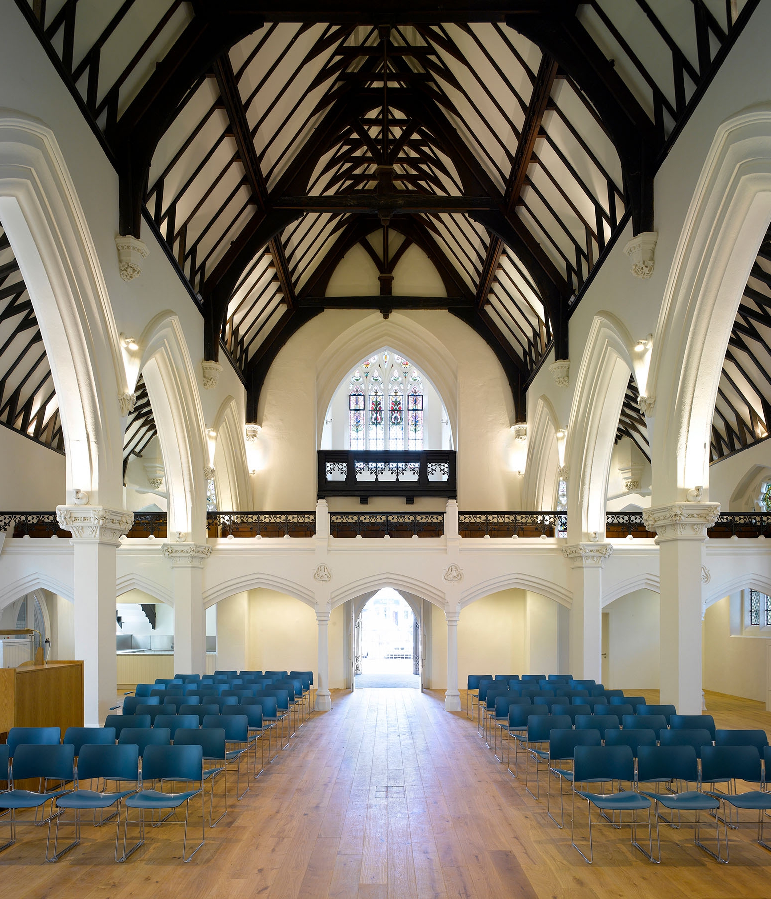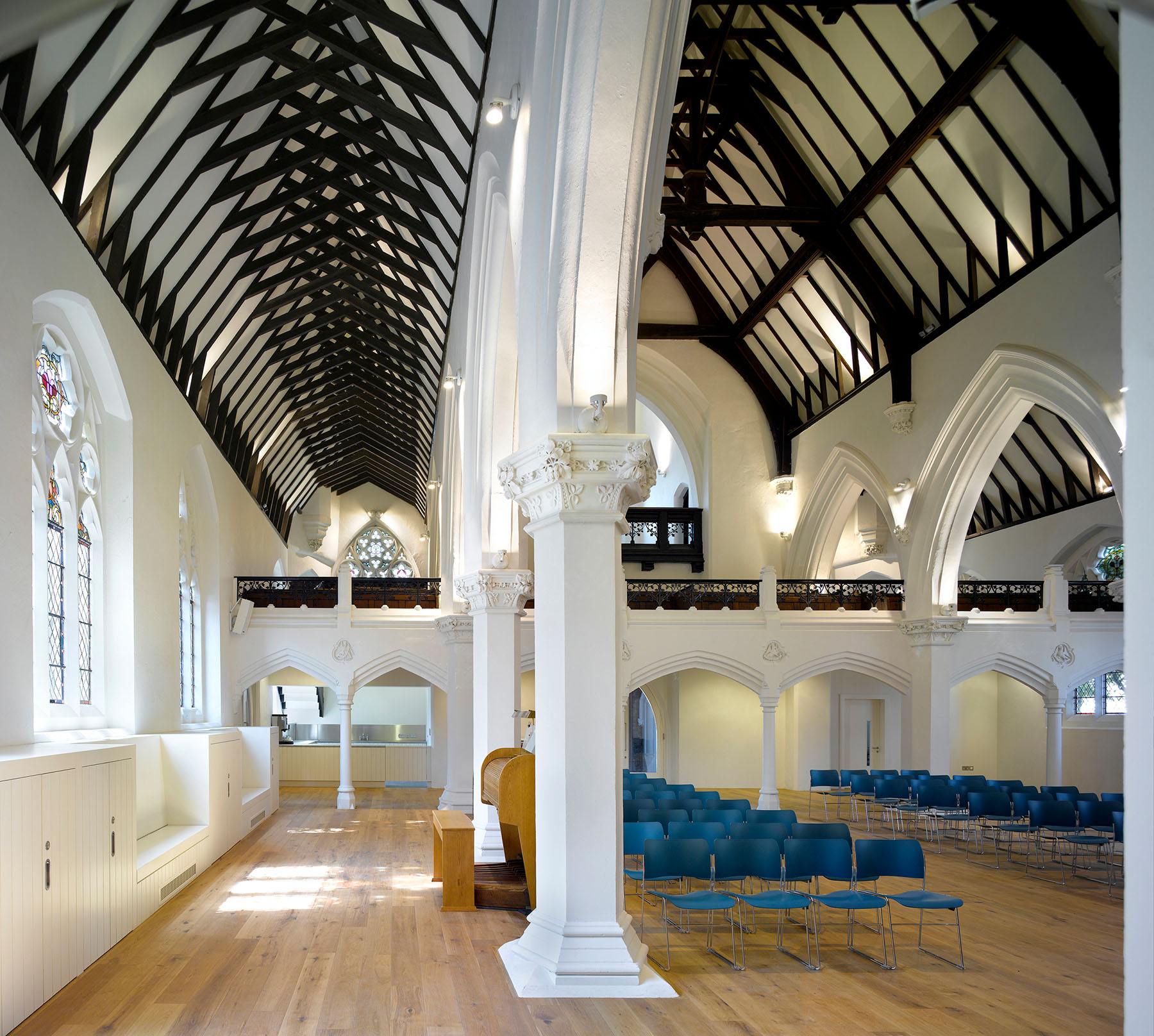 The renovation and re-planning of the existing Grade II listed building includes the creation of two newly refurbished entrances that were key for church members in creating direct contact with the outside. These consist of glazed front doors to the main entrance and newly opened west entrance. Accessibility is improved throughout with the creation of a new ramped entrance to the rear hall and fully accessible WCs and kitchen. The main church space is detailed to enable different types of activity to take place from church services to Scout meetings and youth workshops to playgroup sessions. Flexible storage and robust fittings ensure that different user groups can work well within the space.