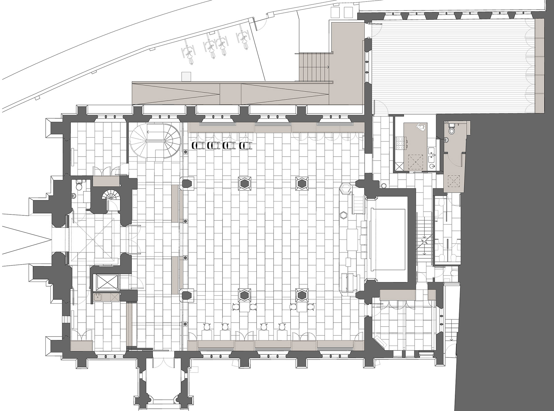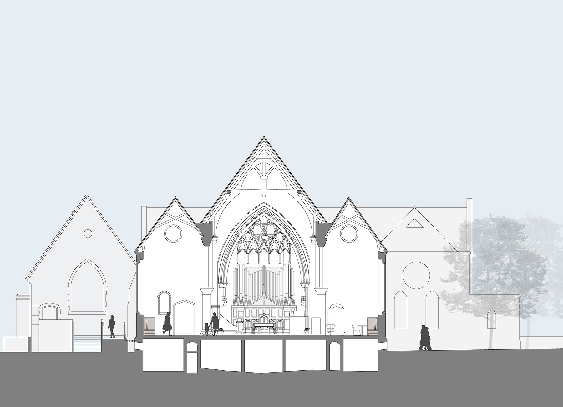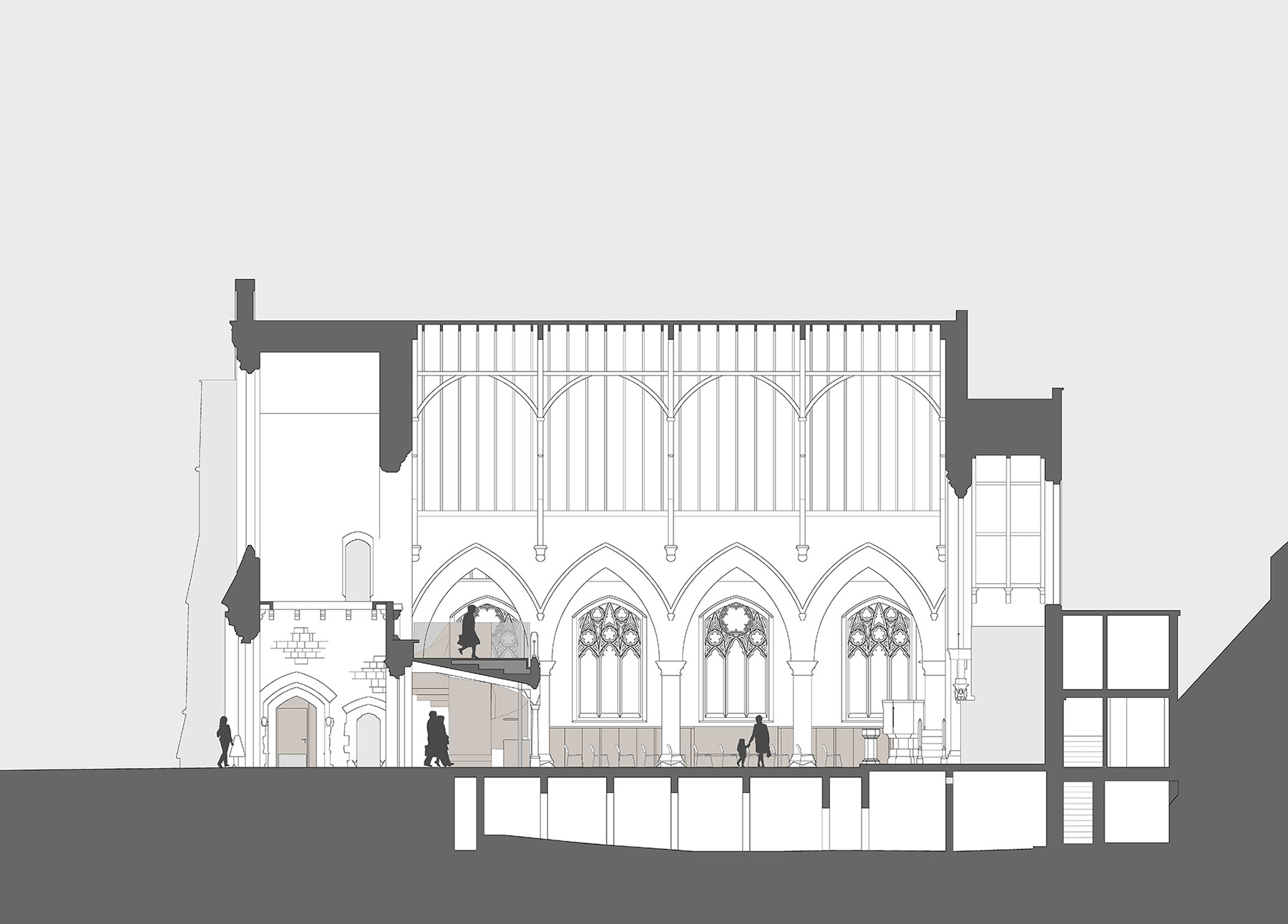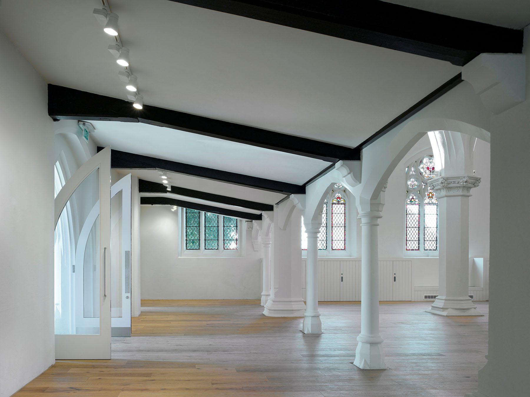The renovation and re-planning of the existing Grade II listed building includes the creation of two newly refurbished entrances that were key for church members in creating direct contact with the outside. These consist of glazed front doors to the main entrance and newly opened west entrance. Accessibility is improved throughout with the creation of a new ramped entrance to the rear hall and fully accessible WCs and kitchen. The main church space is detailed to enable different types of activity to take place from church services to Scout meetings and youth workshops to playgroup sessions. Flexible storage and robust fittings ensure that different user groups can work well within the space.